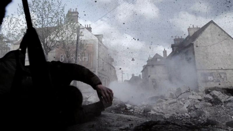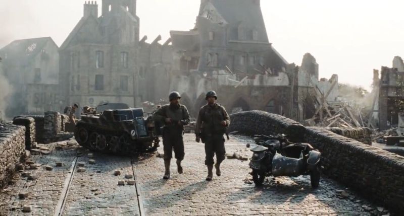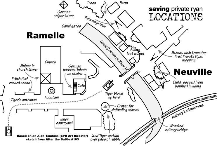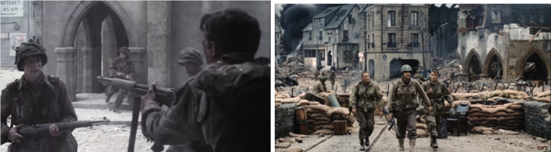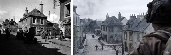 … on the Carentan set in Band of Brothers (left) and in Ramelle (background on the right) in Saving Private Ryan.