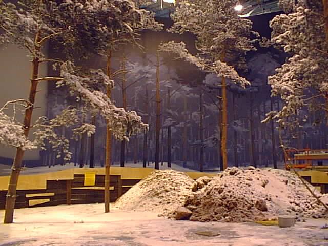 Hatfield provided more than just the multi-purpose town set. The village itself served as the production’s headquarters, and the two aerodrome hangars were used to store props, costumes, weapons and tanks, a C-47 transport plane (The C-47) … and even entire sets. The winter forest surrounding Bastogne was painstakingly constructed inside the other hangar using a combination of real and fiberglass trees (the latter could be broken apart to simulate the effect of German artillery shells) and trees painted on the walls. (The real trees came from a nearby forest  where a large area had to be cleared for the concentration camp set.) It’s estimated that more than 300,000 pounds (136,000 kg) of paper mixed with polymers was used as fake snow, and it took four weeks to cover the set in it.